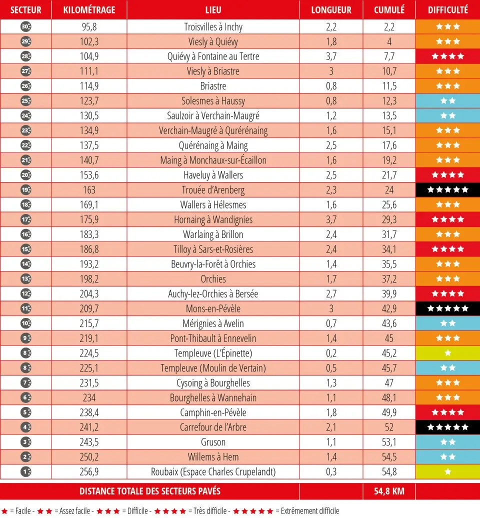 Les notes des 30 secteurs pavés (54,8 km) de Paris-Roubaix 2026