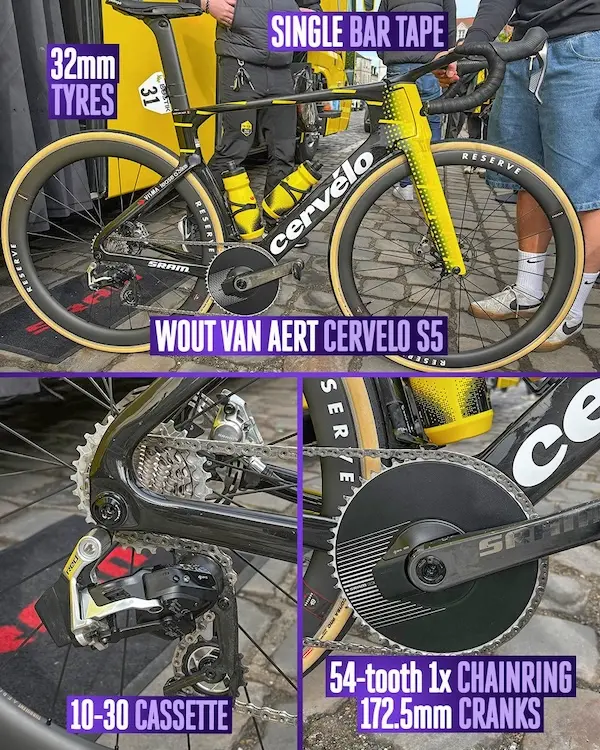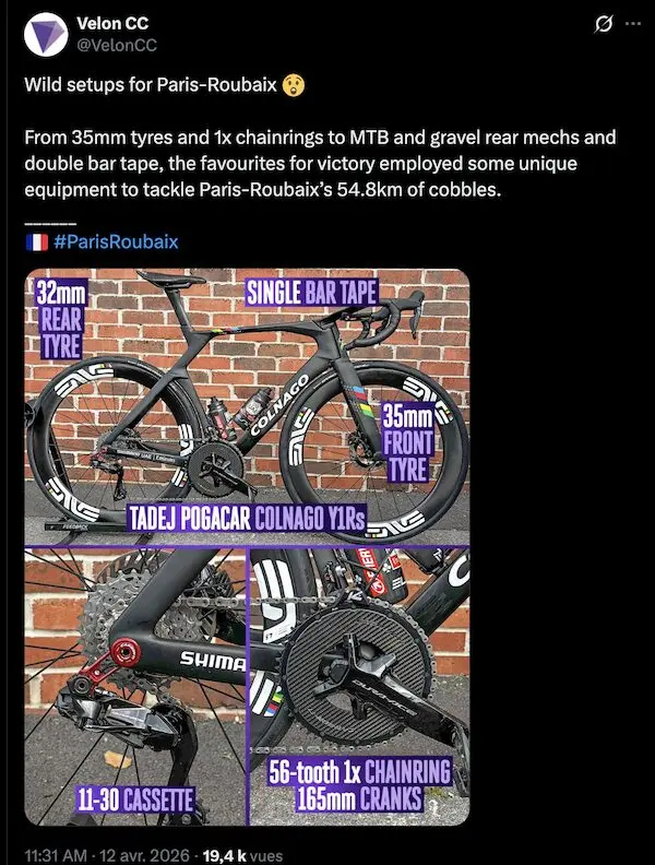 Les choix de transmission illustrent parfaitement cette évolution : les deux premiers de l’épreuve, Wout van Aert et Tadej Pogačar, ont opté pour des configurations en mono-plateau, respectivement en 54/10 pour le Belge et 56/11 pour le Slovène. Des choix radicaux, rendus possibles par la fiabilité des transmissions modernes et la nécessité de simplifier la gestion de l’effort sur un terrain chaotique. Pour certaines équipes, on a même vu l’adoption de dérailleurs de VTT, équipés de ressorts plus tendus, afin de minimiser les risques de sauts de chaine en plein effort.
