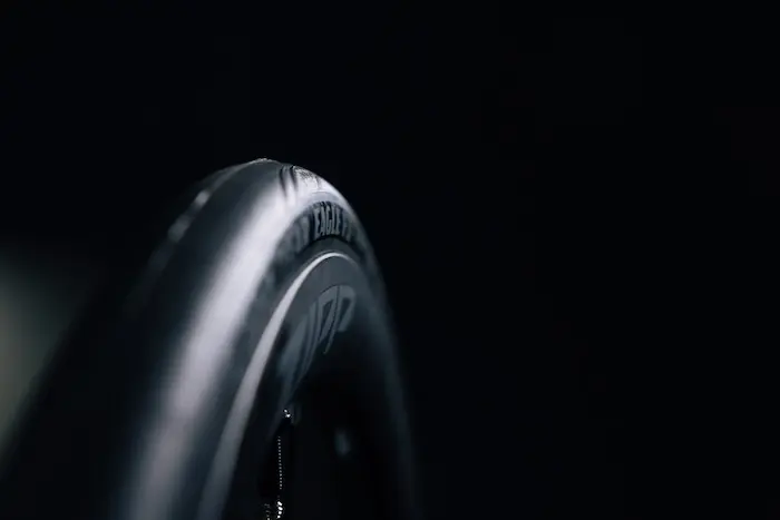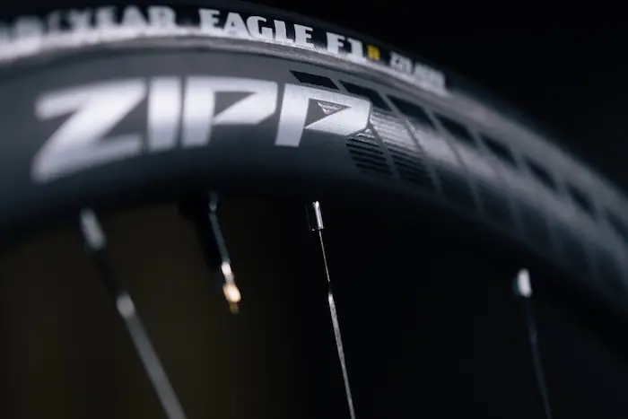 La largeur interne de 23 mm s’inscrit dans les standards actuels et favorise l’utilisation de pneus plus larges à basse pression, ici avec une conception de jante sans crochets. Zipp affirme que ce choix technique permet de réduire la résistance au roulement et d’améliorer le confort, tout en optimisant le rendement global sur la durée. Pour aller plus loin dans ce concept, la marque a développé un pneu en collaboration avec Goodyear, ici le Eagle F1 Z29, parfaitement adapté à la forme de la jante, avec une carcasse positionnée de manière optimale et une bande de roulement correctement dimensionnée. L’objectif est double : éviter une déformation de la carcasse, nuisible aux performances avec l’utilisation de pneus non spécifiques, et optimiser la liaison entre les flancs du pneu et la jante, pour un meilleur aérodynamisme.