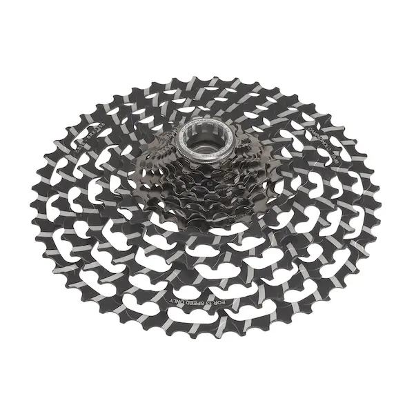 La cassette 13 vitesses adopte une construction spécifique avec une première partie en finition Black Chrome, tandis que le bloc final de pignons reçoit un traitement Satin Black à base de zinc et de silicium, avec un revêtement noir améliorant la résistance à l’usure. Une texture gravée au laser vient renforcer son identité visuelle et technique.